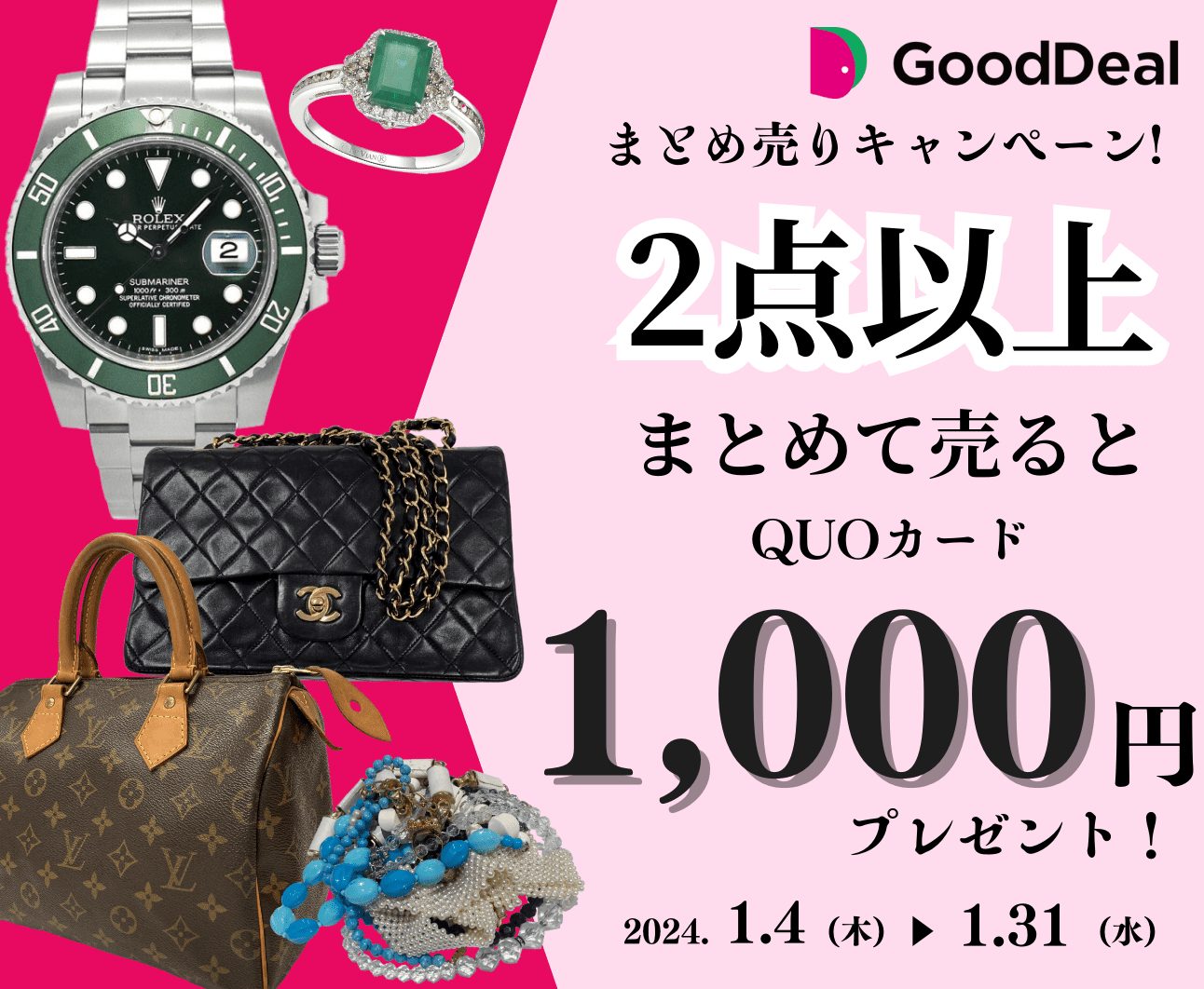 GoodDealの出張・宅配・来店買取をご利用いただき、以下のキャンペーン条件を満たす方、全員にQUOカード1,000円分プレゼント致します。